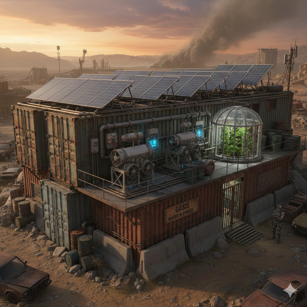 In a post-apocalyptic environment, traditional water sources become scarce due to pollution, damage, or competition. The main function of an air-to-water generator is to extract moisture from the air, making self-sufficiency in water possible in a resource-scarce environment. However, Drinking Water Solutions usually require electricity, which is often difficult to guarantee in the context of a post-apocalyptic economic collapse.